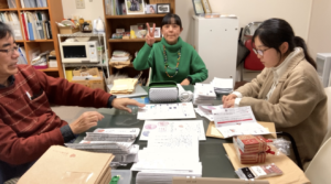今年も、寄付者の皆様に活動報告を送りました。事務所でせっせと封入作業。
